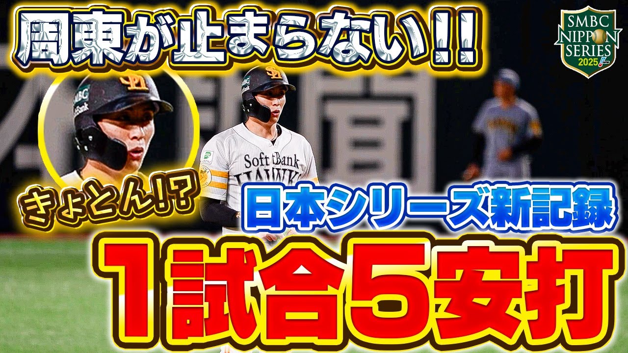 【SMBC日本シリーズ2025】第2戦|思わぬ記録にポカン!?周東佑京選手が日本シリーズ新記録!【全員で、日本一へ!】 トレンド X Facebook Hatena Bookmark Pocket LINE Copy 2025.10.30 周東佑京 選手が日本シリーズ新記録となる1試合5安打を放つ活躍! 第1打席:右前安打 第2打席:適時三塁打 第3打席:中安打 …