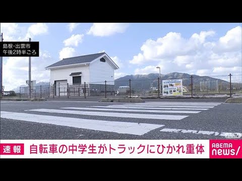 自転車で通学途中の女子中学生が横断歩道でトラックにはねられ重体 島根・出雲市(2025年11月21日) トレンド X Facebook Hatena Bookmark Pocket LINE Copy 2025.11.21 島根県出雲市の市道で自転車で通学中の女子中学生(13)がトラックにはねられ、意識不明の重体です。 21日午前8時15分ごろ、 …