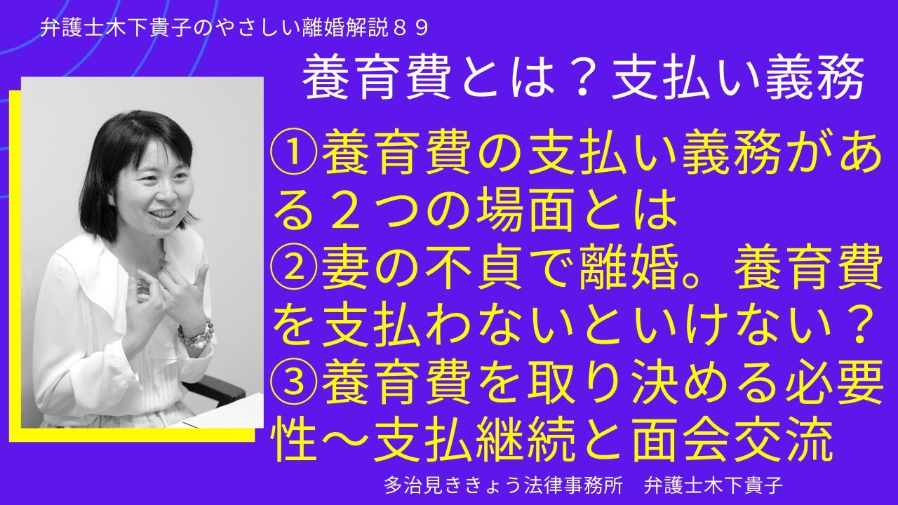 多治見ききょう法律事務所所長弁護士木下貴子(岐阜県弁護士会)が送るやさしい(優しく易しい)動画離婚解説。離婚手続きを自分で進める方法を,弁護士木下貴子(弁護士歴21年)がHPの「養育費とは 〜支払義務・取り決め方法・金額・支払継続対策」の記事を元に動画で解説しています▼